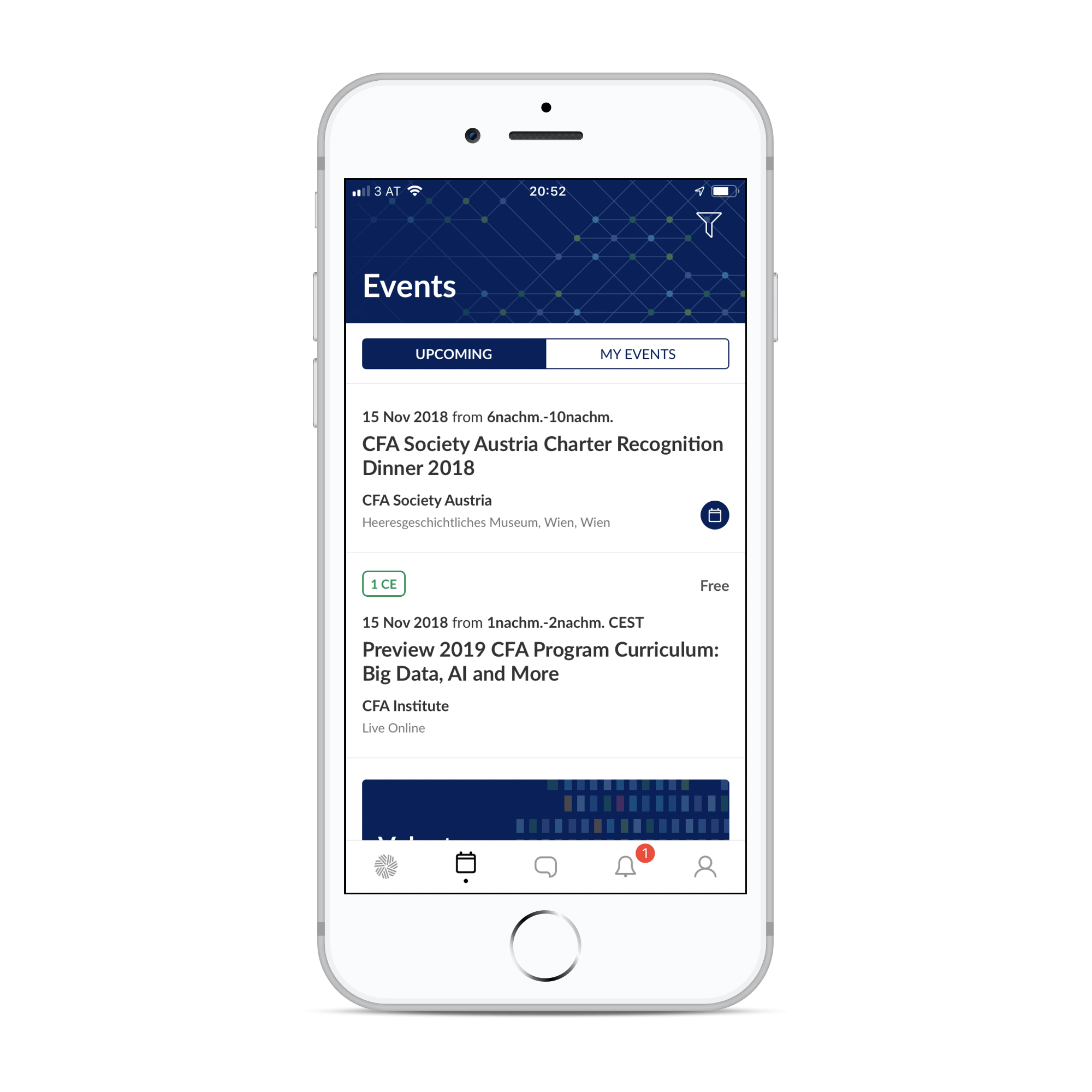 CFA Society Austria is now part the CFA Institute App. All events of CFA Society Austria are listed within the events page of the app. You are able to register for events directly from within the app.